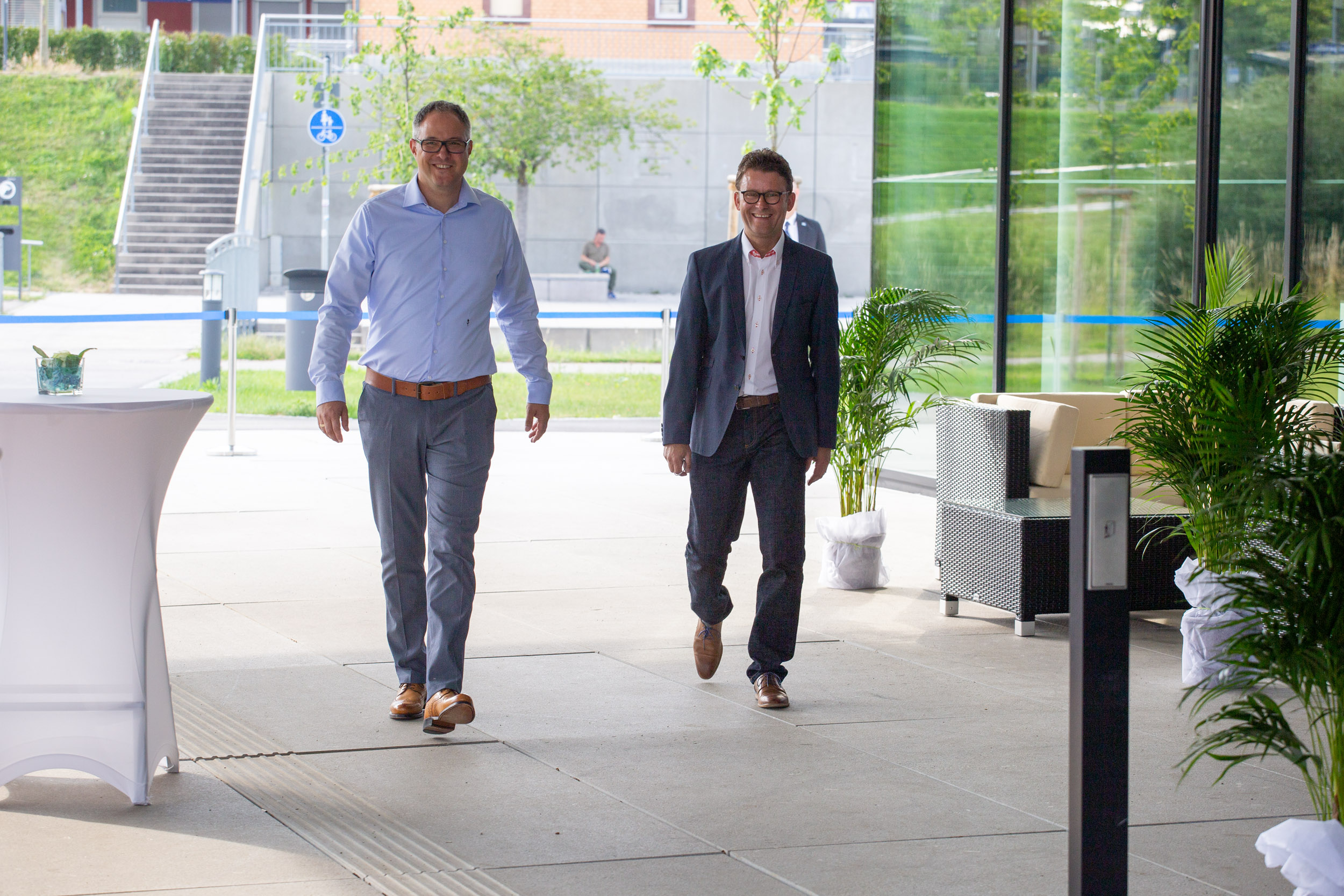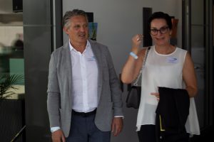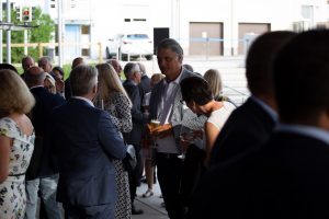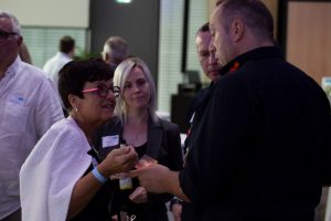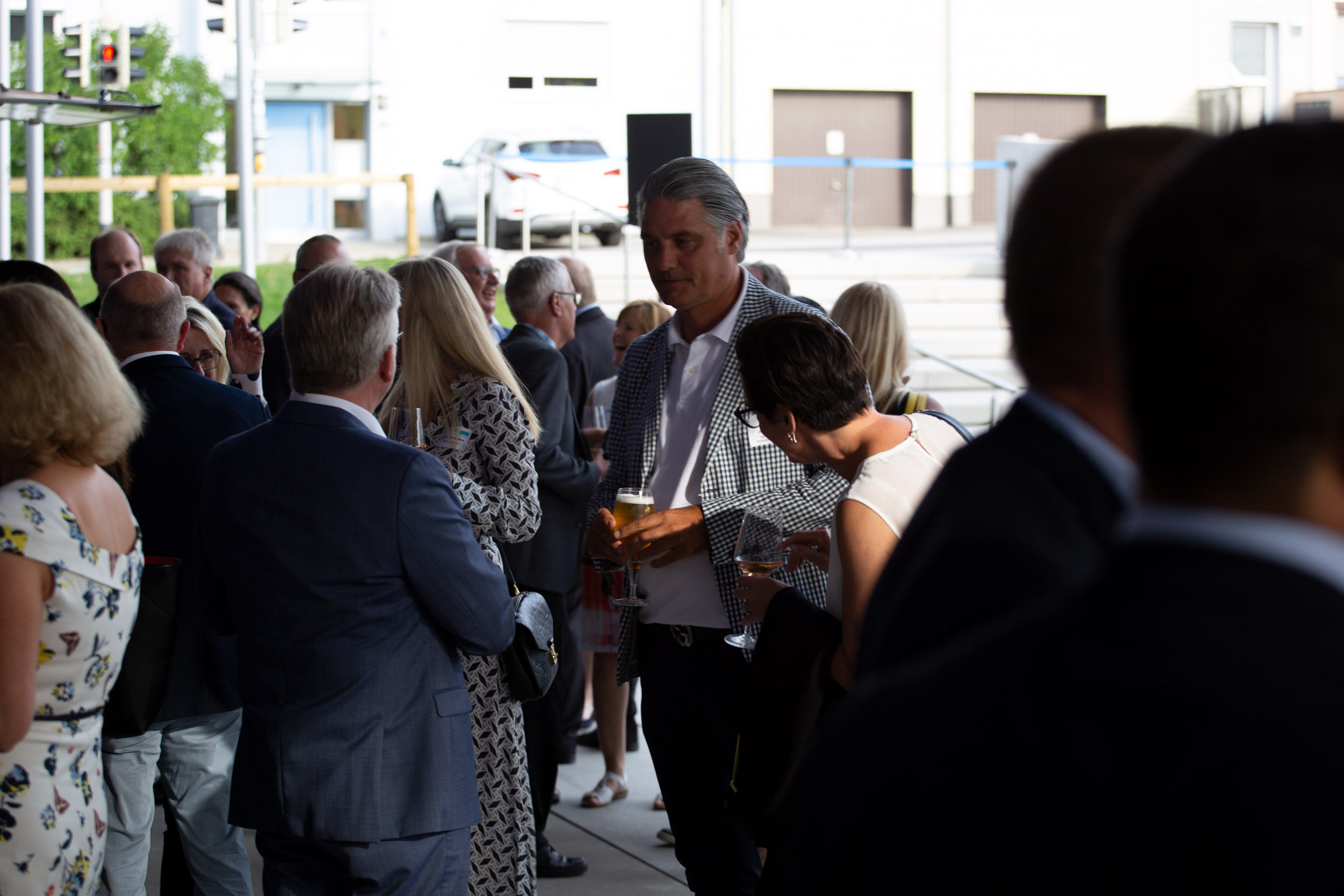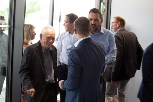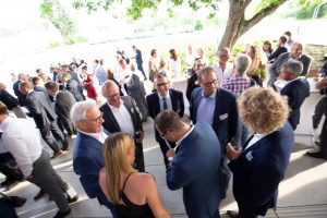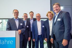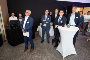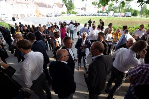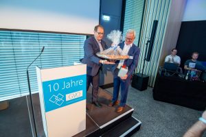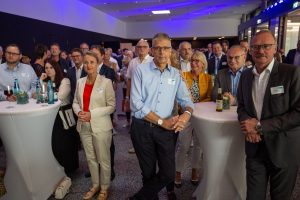 Vor und im Foyer der Schwenninger Neckarhalle ließen es sich die Gäste des GVO gut gehen: Vertreter von rund 130 Unternehmen der Doppelstadt und aus der Politik begingen den Geburtstag, der zugleich auch Gelegenheit zu einer respektablen Bilanz gab. GVO-Präsident Waldmann begrüßte in seiner kurzen, launigen Ansprache Ehrengäste wie Landrat Sven Hinterseh, Oberbürgermeister Jürgen Roth, Bundestagsabgeordneter Dr. Marcel Klinge, IHK-Präsidentin Birgit Hakenjos-Boyd, IHK-Hauptgeschäftsführer Thomas Albiez und viele weitere. Vor zehn Jahren sei der GVO mit 20 Mitgliedern gestartet, heute seien es über 400 Unternehmen – ein fulminantes Wachstum, das der GVO in der Zeit von Waldmanns Präsidentschaft hingelegt hat. Dass Gerhard Waldmann dieses Amt zum Ende des Jahres niederlegen wird, hatte er bereits kommuniziert. Nun nutzte er den feierlichen Rahmen, um seinen und den Wunschkandidaten des GVO-Vorstands zu präsentieren: Der Villinger Architekt Joachim Müller soll demnach in der GVO-Mitgliederversammlung am 28. November zum neuen Präsidenten des Verbands gewählt werden – ein Vorschlag, der einhelligen Applaus unter den Gästen hervorrief.